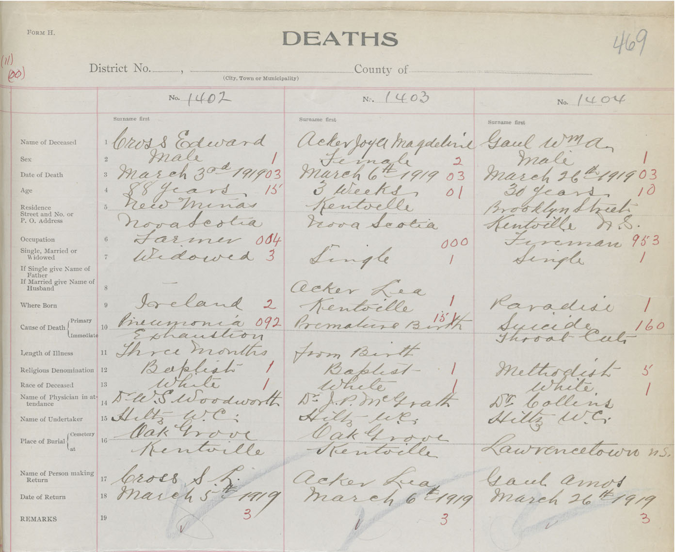 Male Death Registration: Year: 1919 book: 40 page: 469 number: 1402