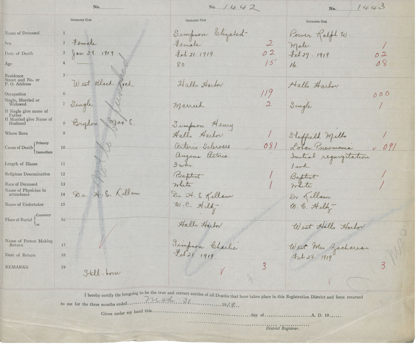 Female Death Registration: Year: 1919 book: 40 page: 481 number: 1442