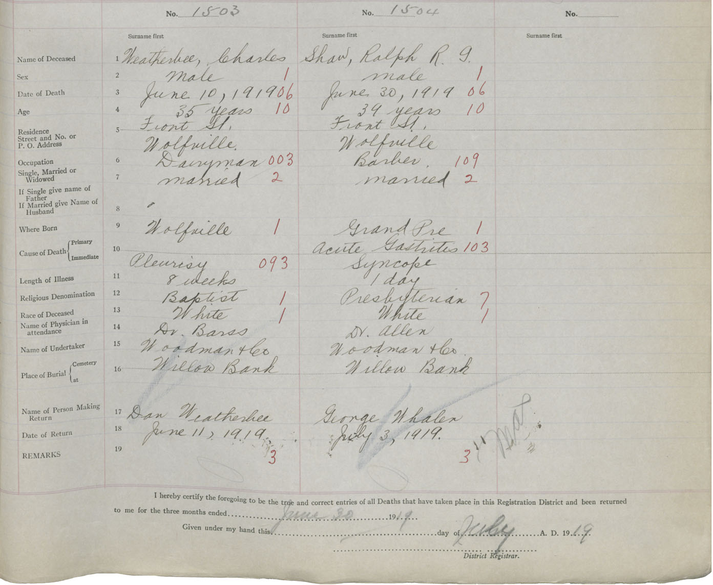 Male Death Registration: Year: 1919 book: 40 page: 499 number: 1503