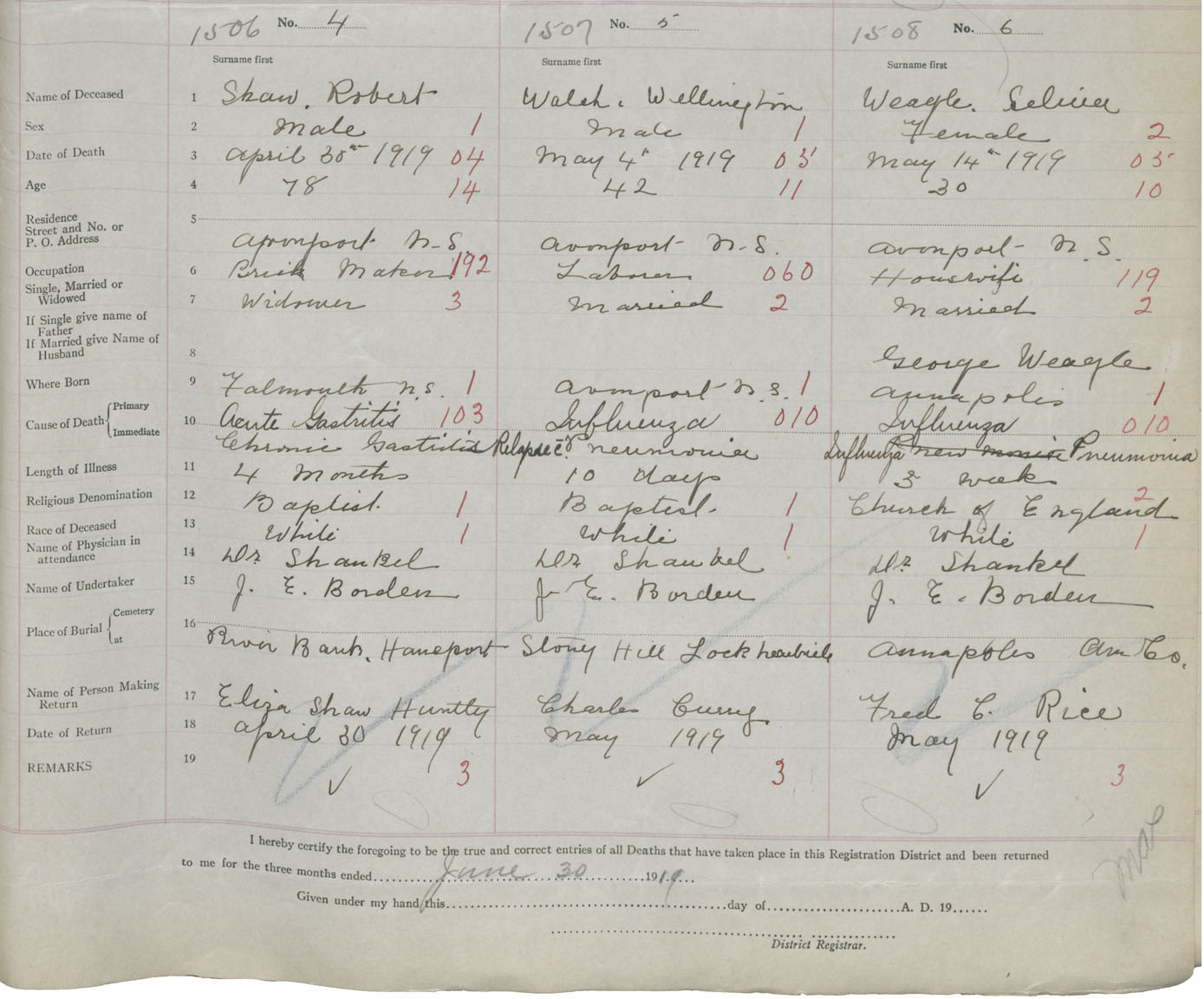 Male Death Registration: Year: 1919 book: 40 page: 501 number: 1506