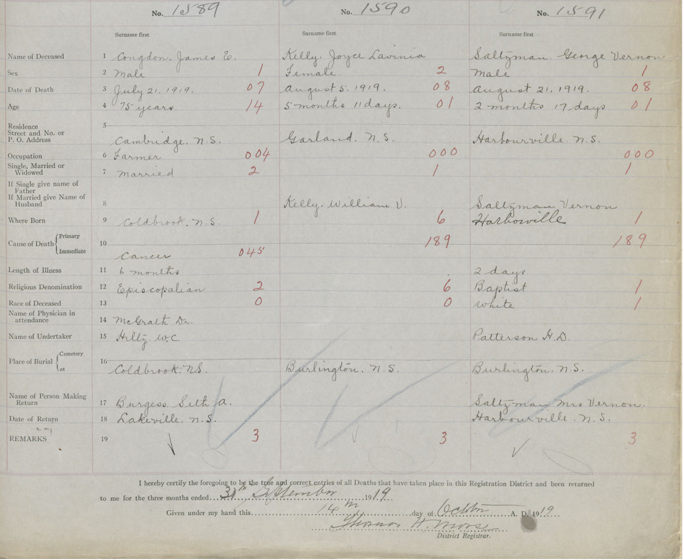 Male Death Registration: Year: 1919 book: 40 page: 529 number: 1589
