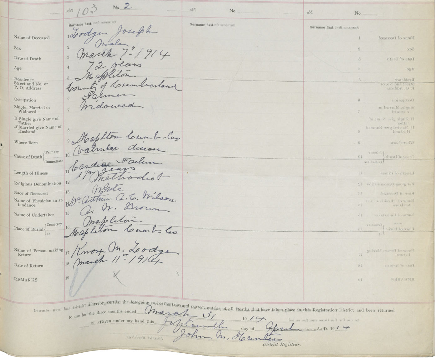 Male Death Registration: Year: 1914 book: 41 page: 27 number: 103