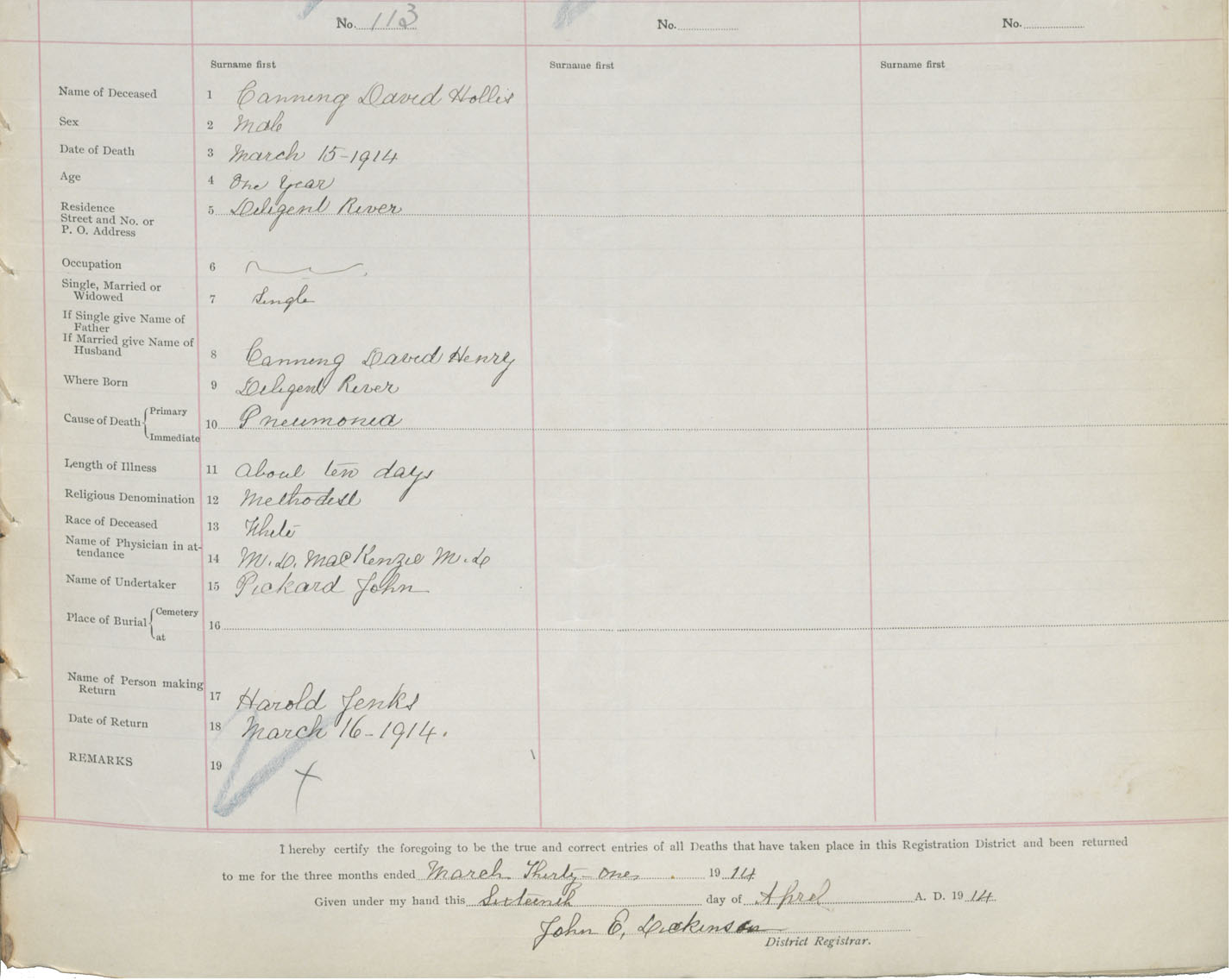Male Death Registration: Year: 1914 book: 41 page: 31 number: 113