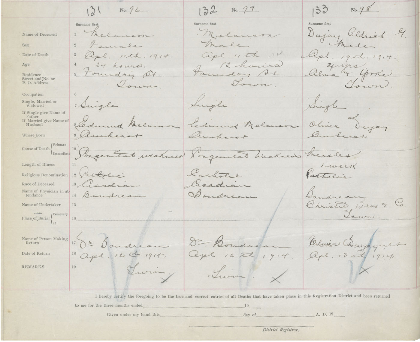 Male Death Registration: Year: 1914 book: 41 page: 36 number: 133