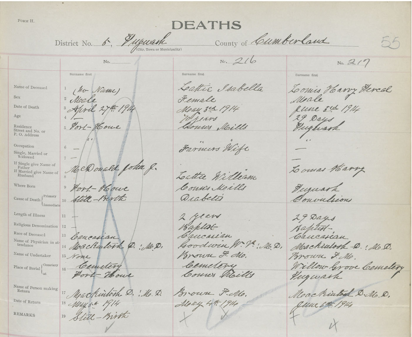 Male Death Registration: Year: 1914 book: 41 page: 55 number: 217