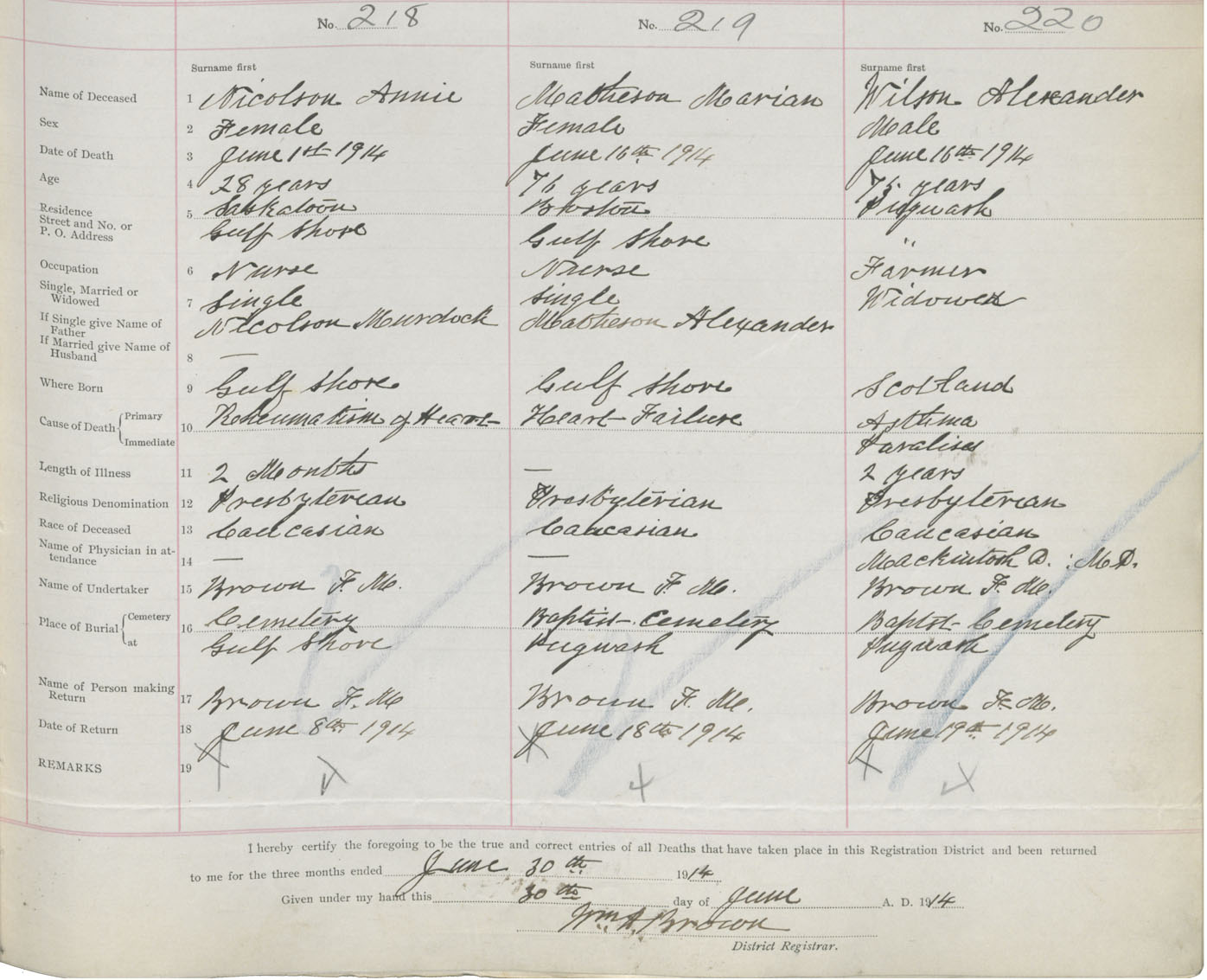 Male Death Registration: Year: 1914 book: 41 page: 55 number: 220