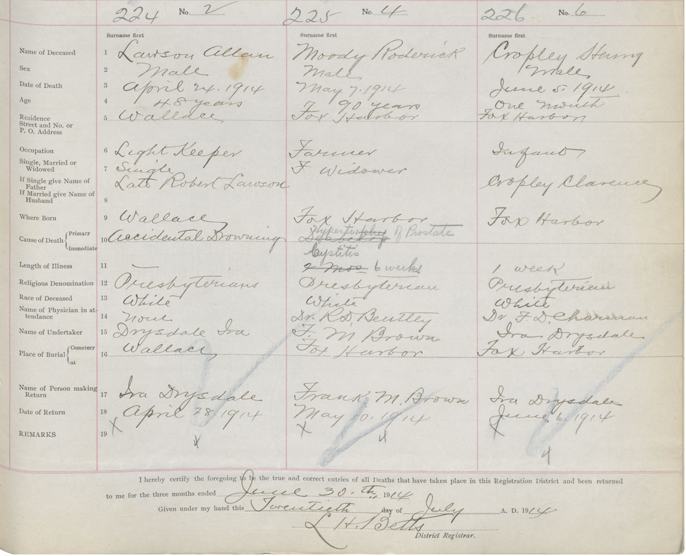 Male Death Registration: Year: 1914 book: 41 page: 57 number: 226