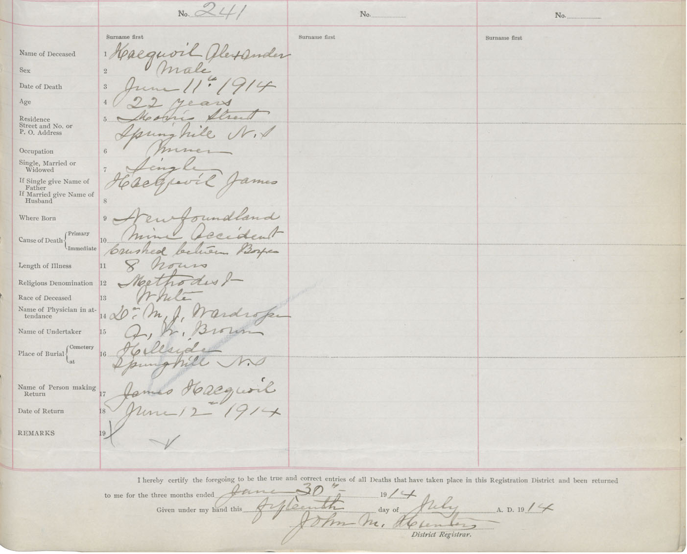 Male Death Registration: Year: 1914 book: 41 page: 61 number: 241