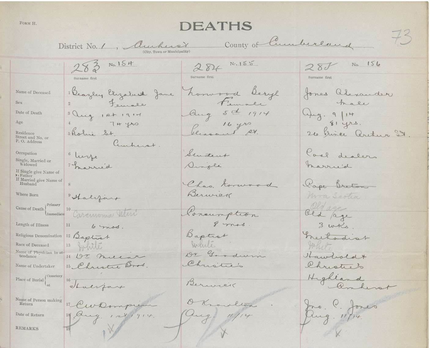 Female Death Registration: Year: 1914 book: 41 page: 73 number: 283