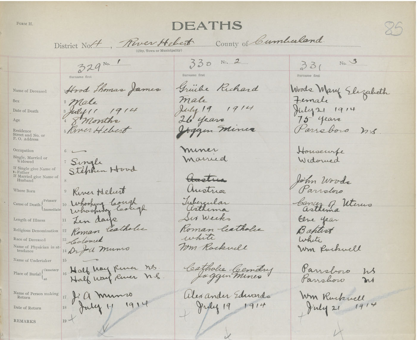 Male Death Registration: Year: 1914 book: 41 page: 85 number: 329