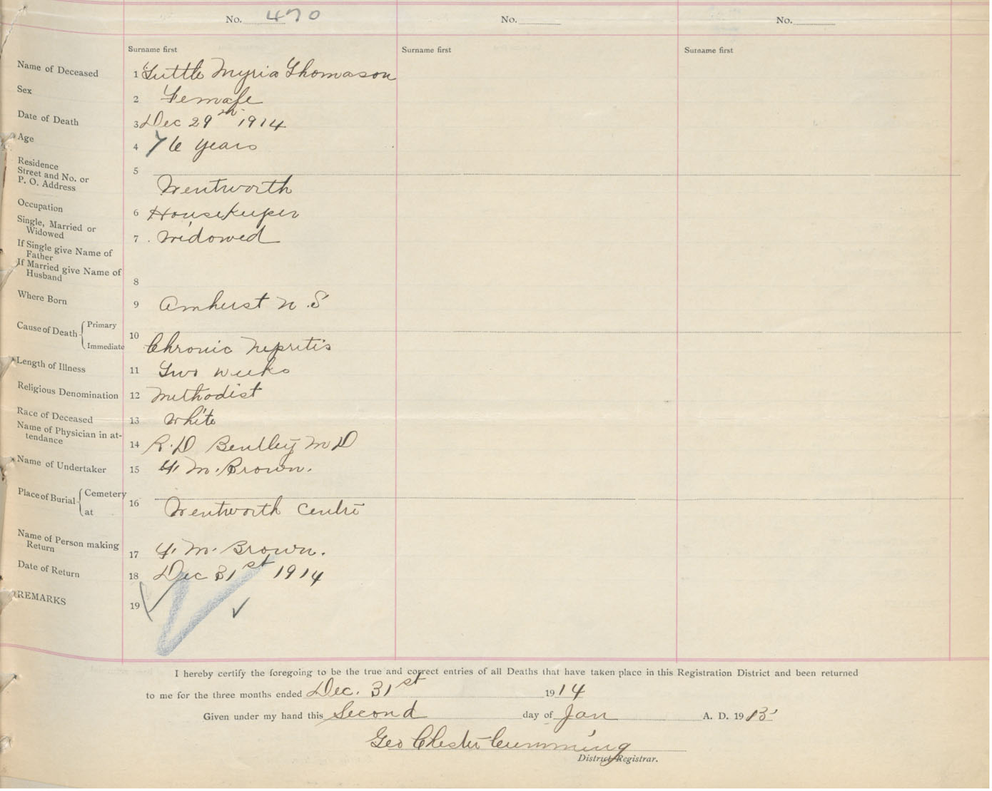 Female Death Registration: Year: 1914 book: 41 page: 117 number: 470