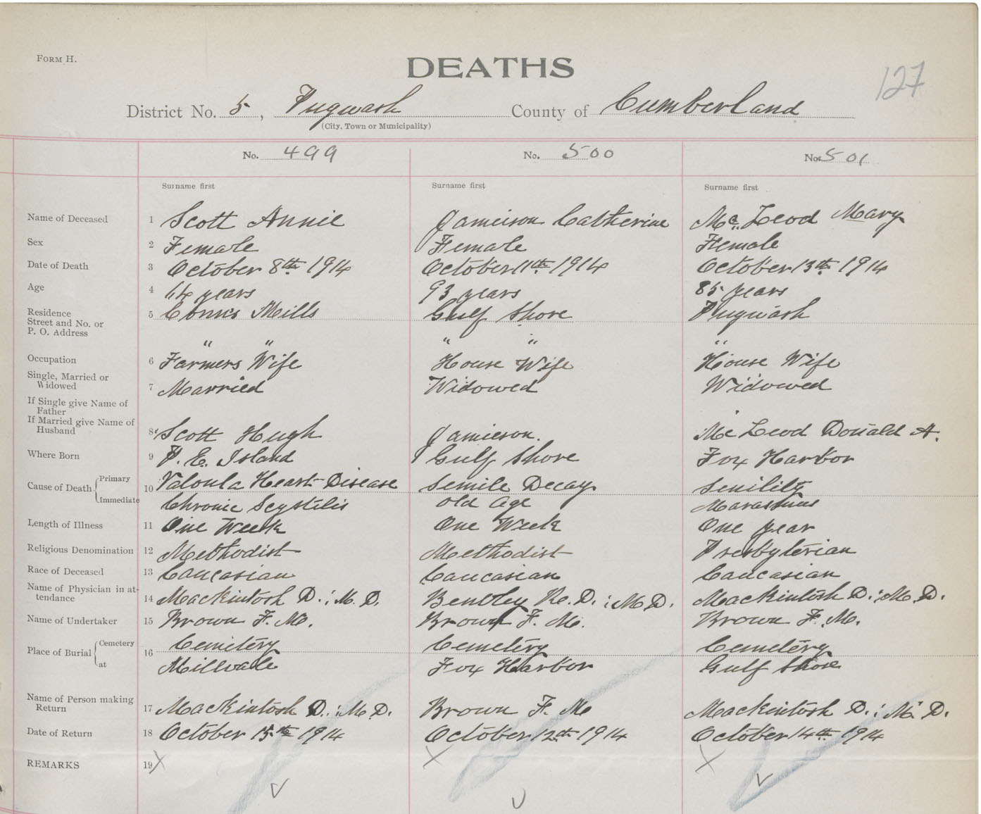 Female Death Registration: Year: 1914 book: 41 page: 127 number: 499