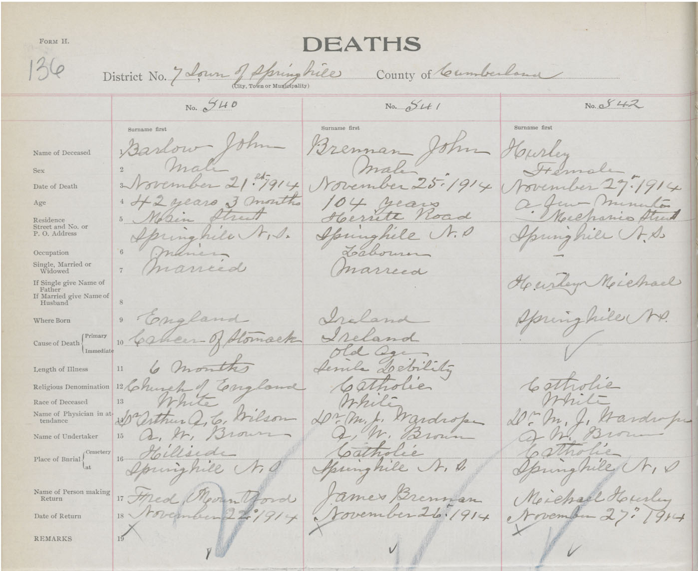 Male Death Registration: Year: 1914 book: 41 page: 136 number: 540