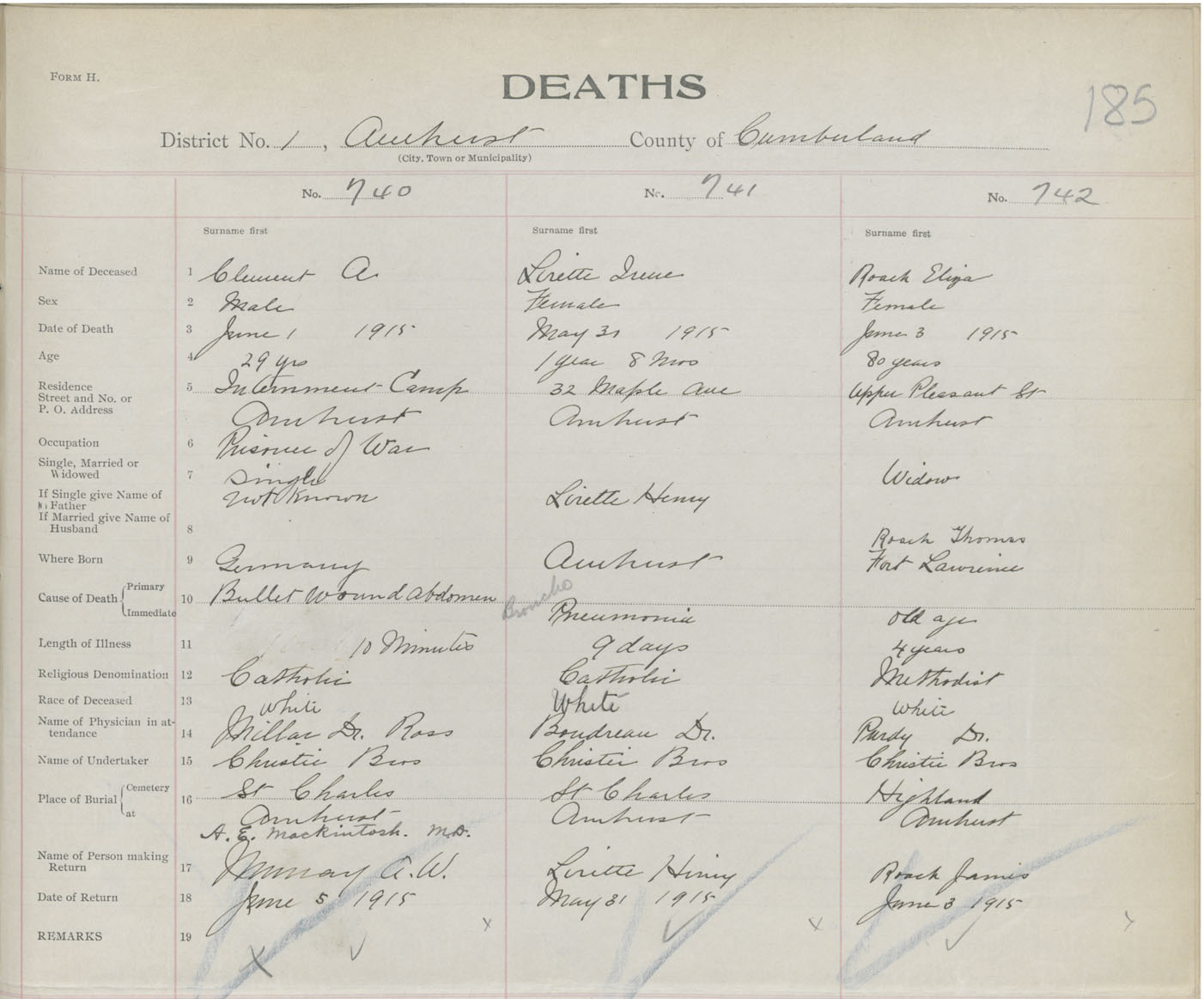 Female Death Registration: Year: 1915 book: 41 page: 185 number: 742