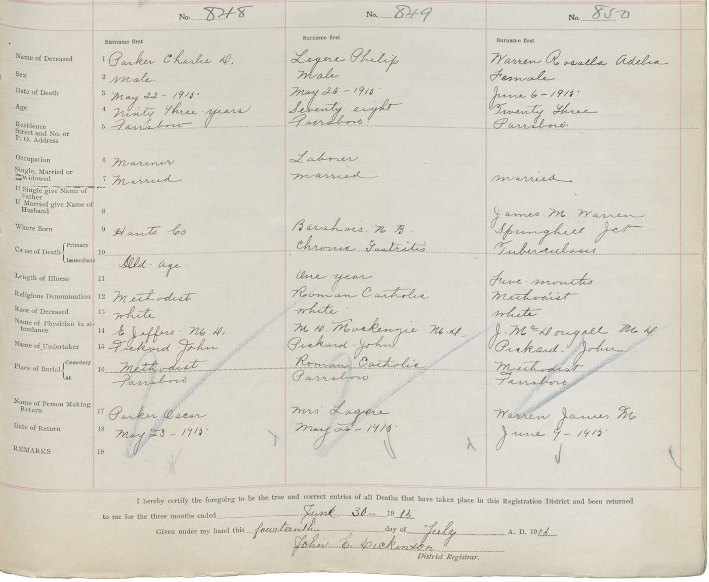 Female Death Registration: Year: 1915 book: 41 page: 215 number: 850