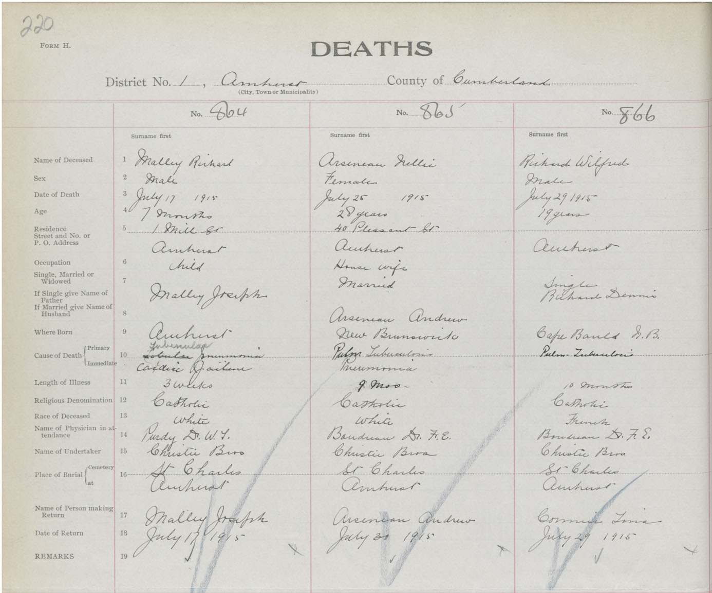Male Death Registration: Year: 1916 book: 41 page: 220 number: 866