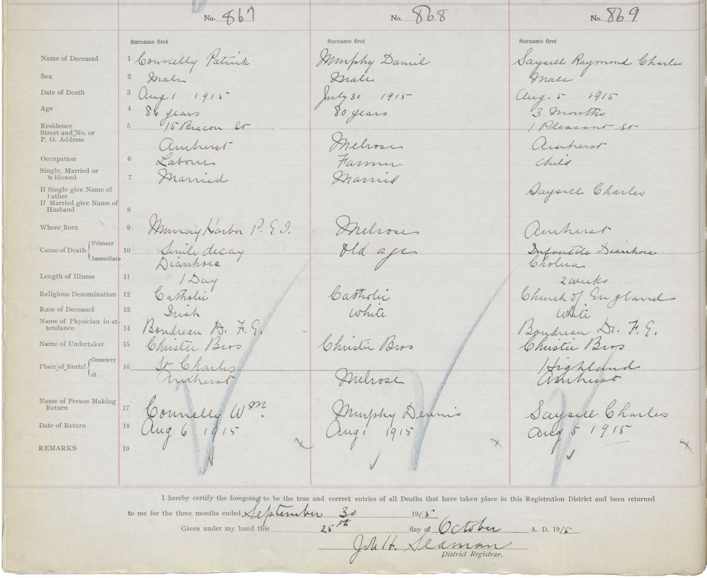 Male Death Registration: Year: 1915 book: 41 page: 220 number: 869