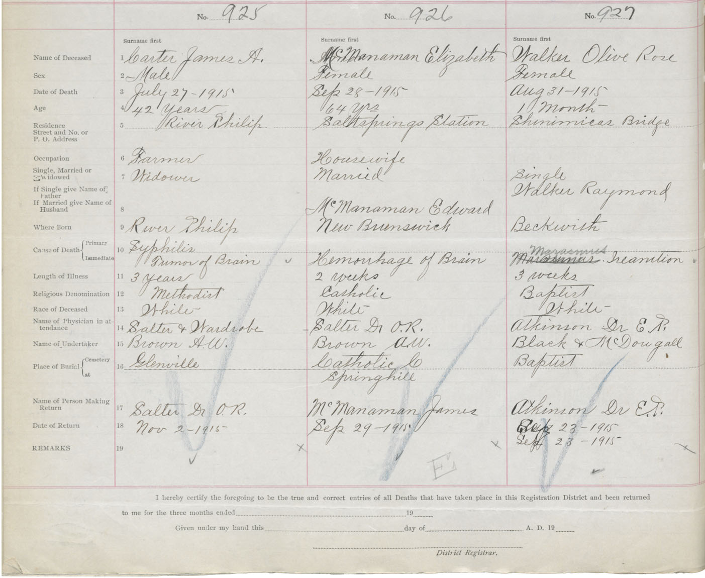 Female Death Registration: Year: 1915 book: 41 page: 232 number: 927