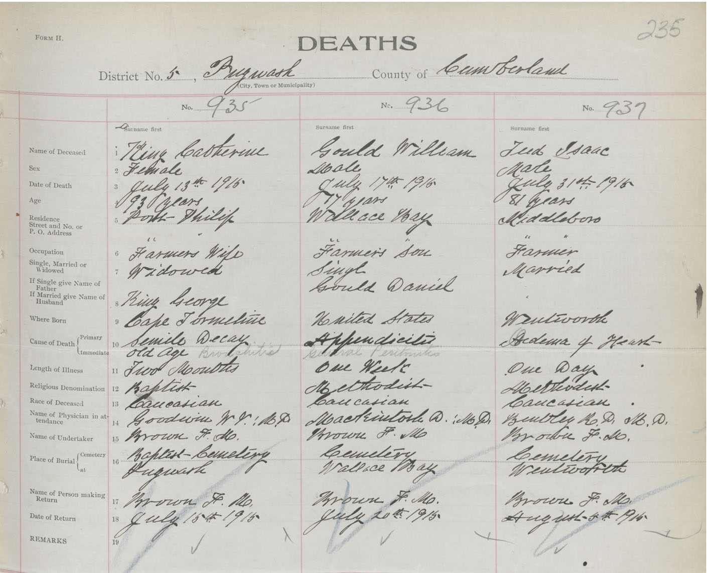 Male Death Registration: Year: 1915 book: 41 page: 235 number: 937