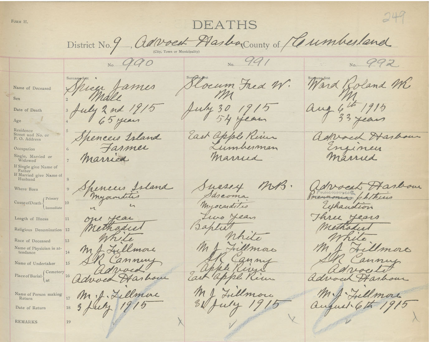 Male Death Registration: Year: 1915 book: 41 page: 249 number: 992