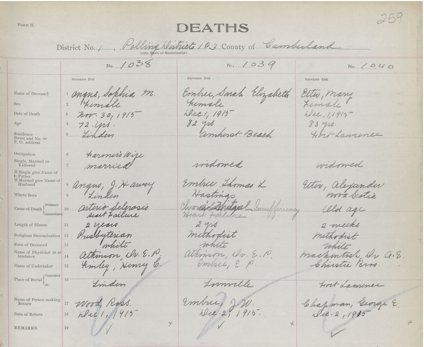 Female Death Registration: Year: 1915 book: 41 page: 259 number: 1038
