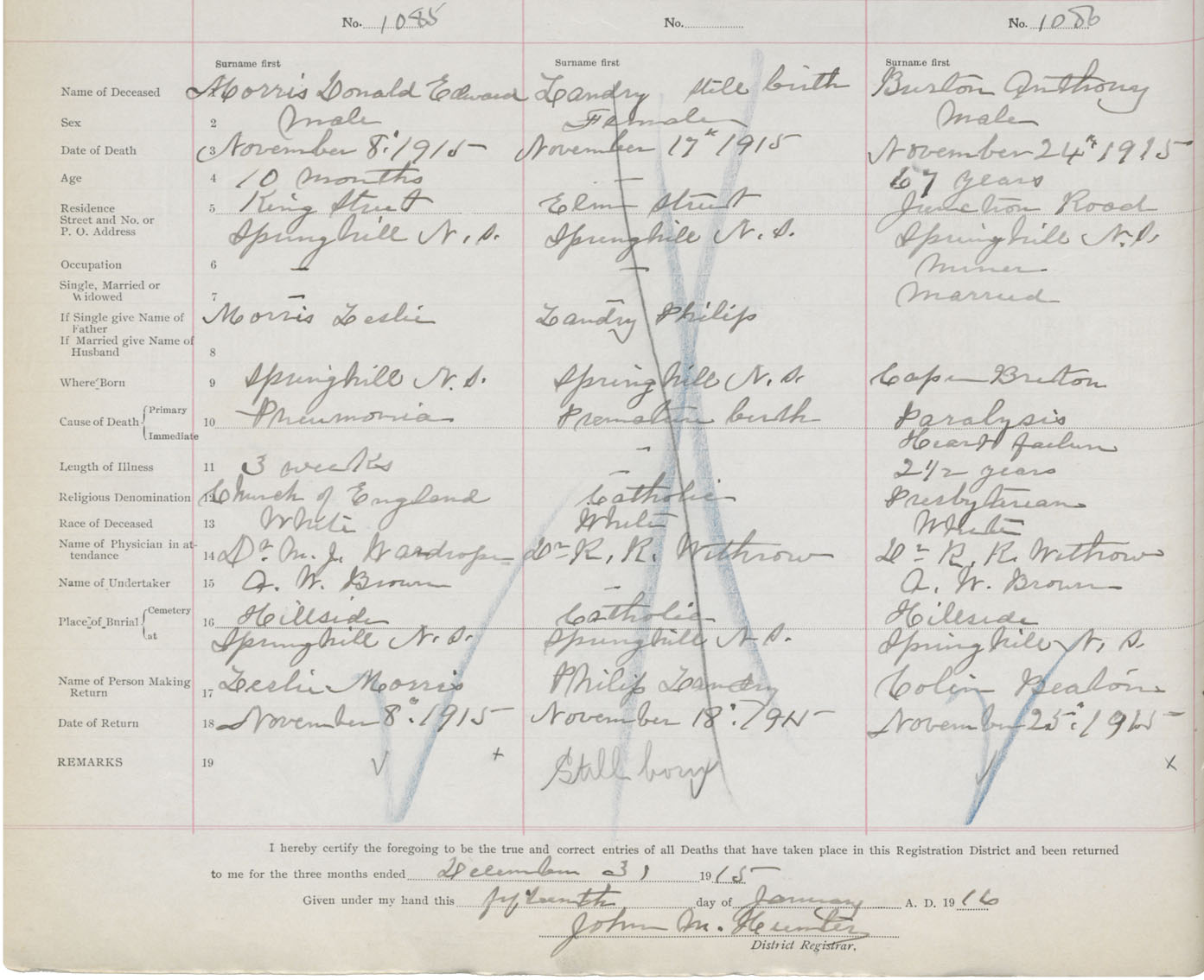 Male Death Registration: Year: 1915 book: 41 page: 272 number: 1085