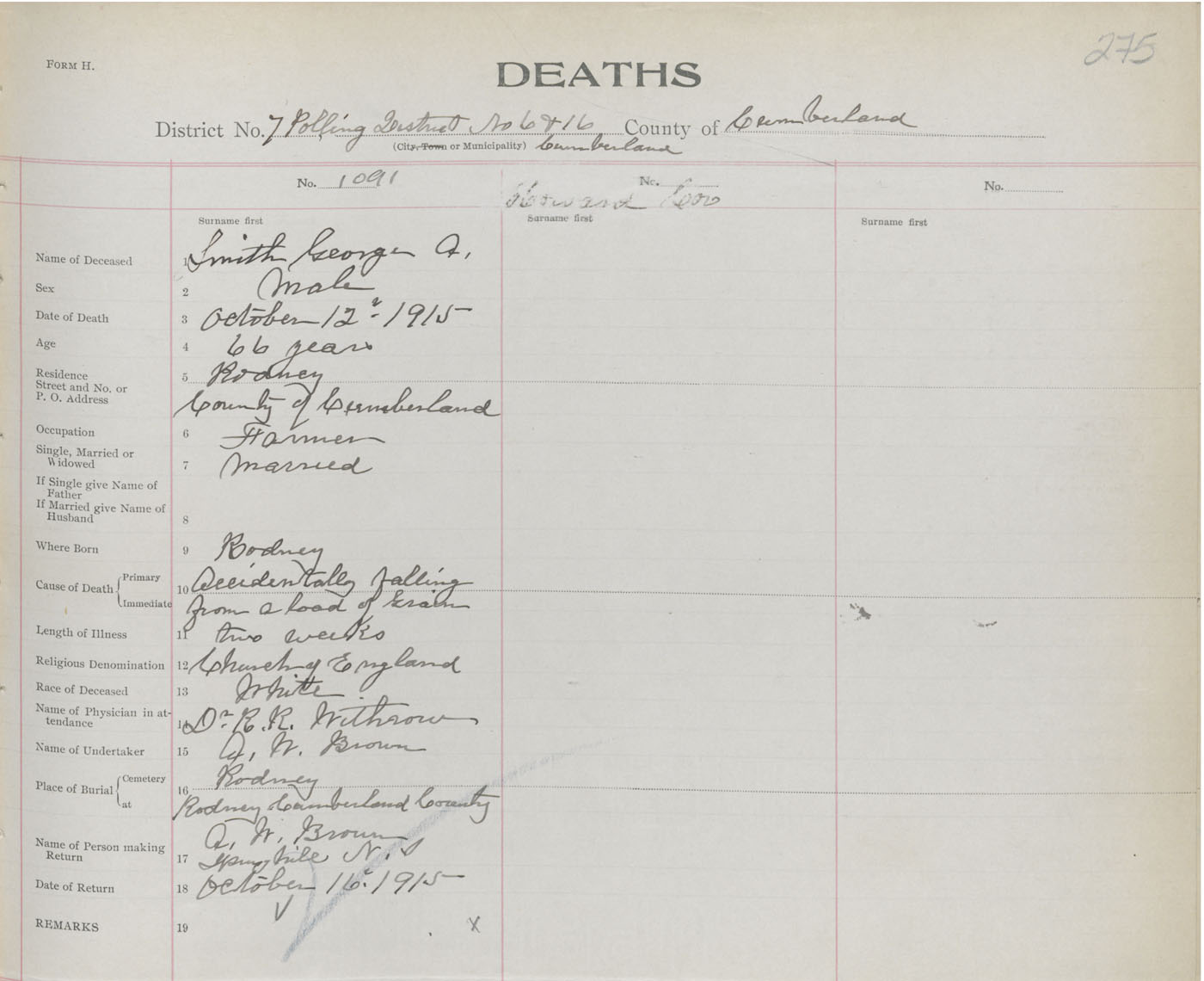 Male Death Registration: Year: 1915 book: 41 page: 275 number: 1091