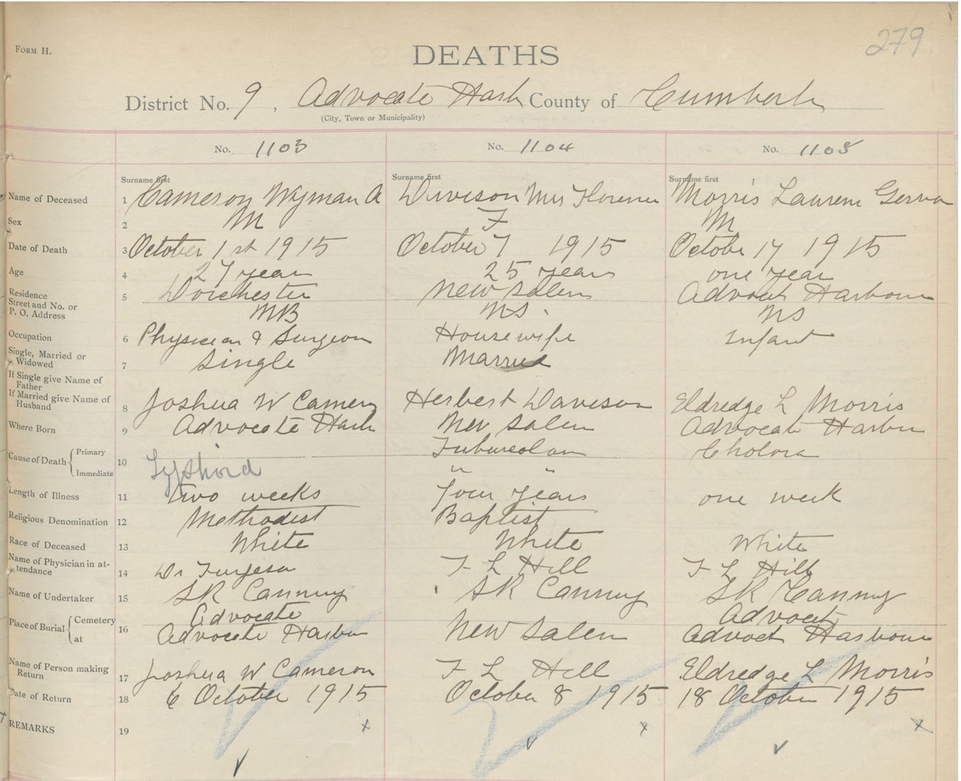 Male Death Registration: Year: 1915 book: 41 page: 279 number: 1103