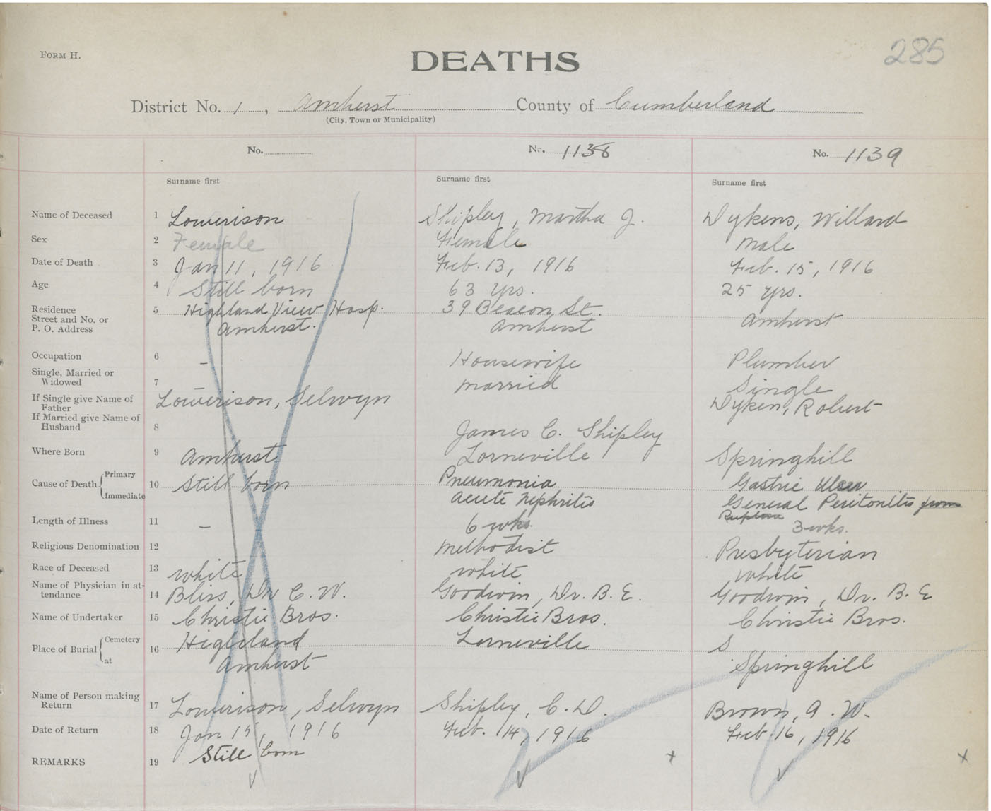 Male Death Registration: Year: 1916 book: 41 page: 285 number: 1139