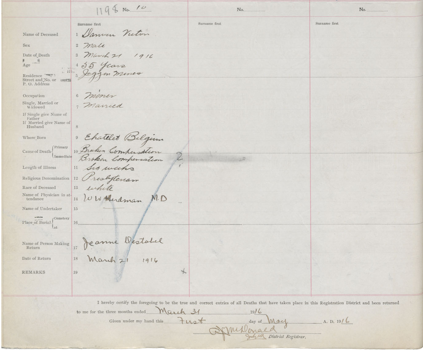 Male Death Registration: Year: 1916 book: 41 page: 298 number: 1198