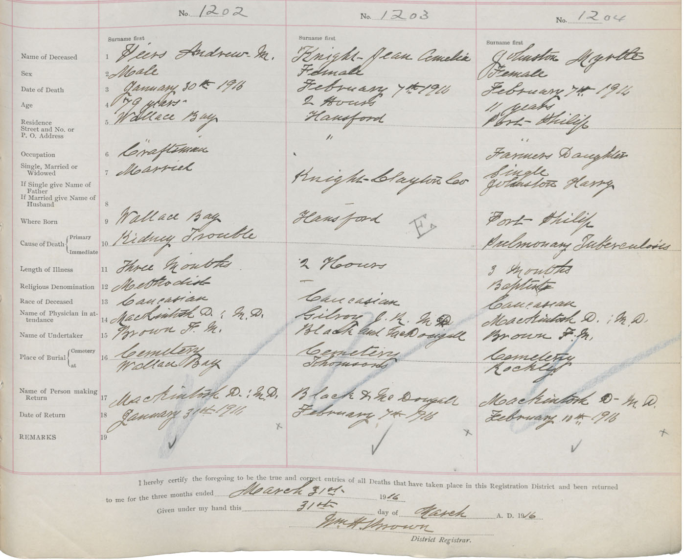 Female Death Registration: Year: 1916 book: 41 page: 299 number: 1204