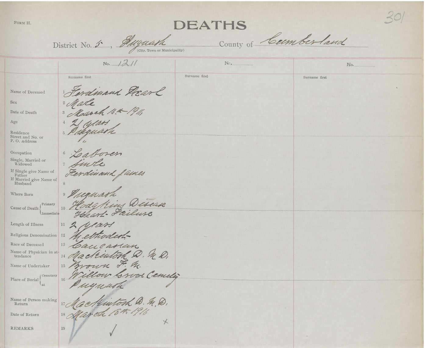 Male Death Registration: Year: 1916 book: 41 page: 301 number: 1211