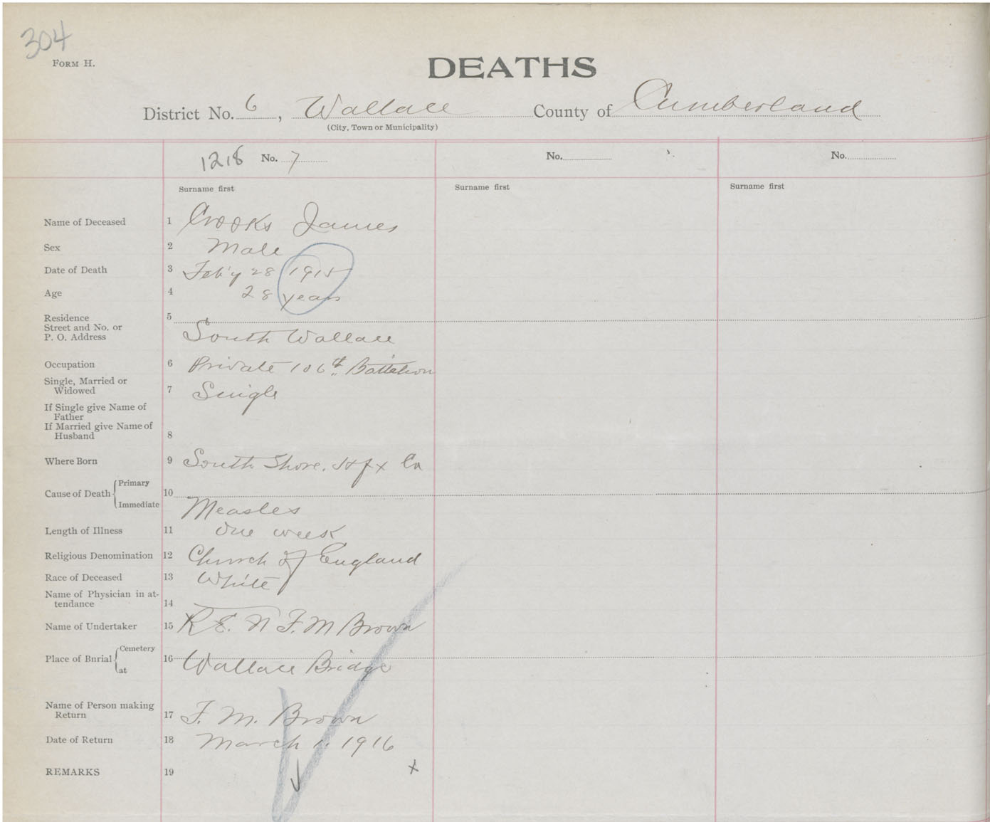 Male Death Registration: Year: 1915 book: 41 page: 304 number: 1218