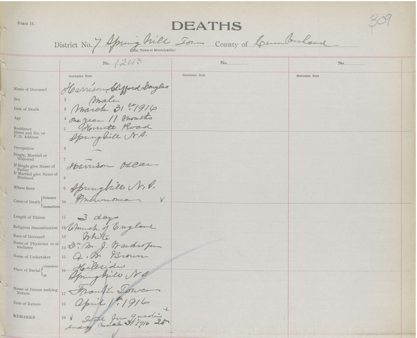 Male Death Registration: Year: 1916 book: 41 page: 309 number: 1243