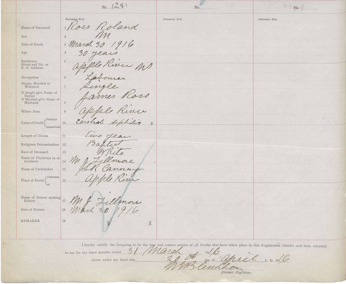 Male Death Registration: Year: 1916 book: 41 page: 318 number: 1281