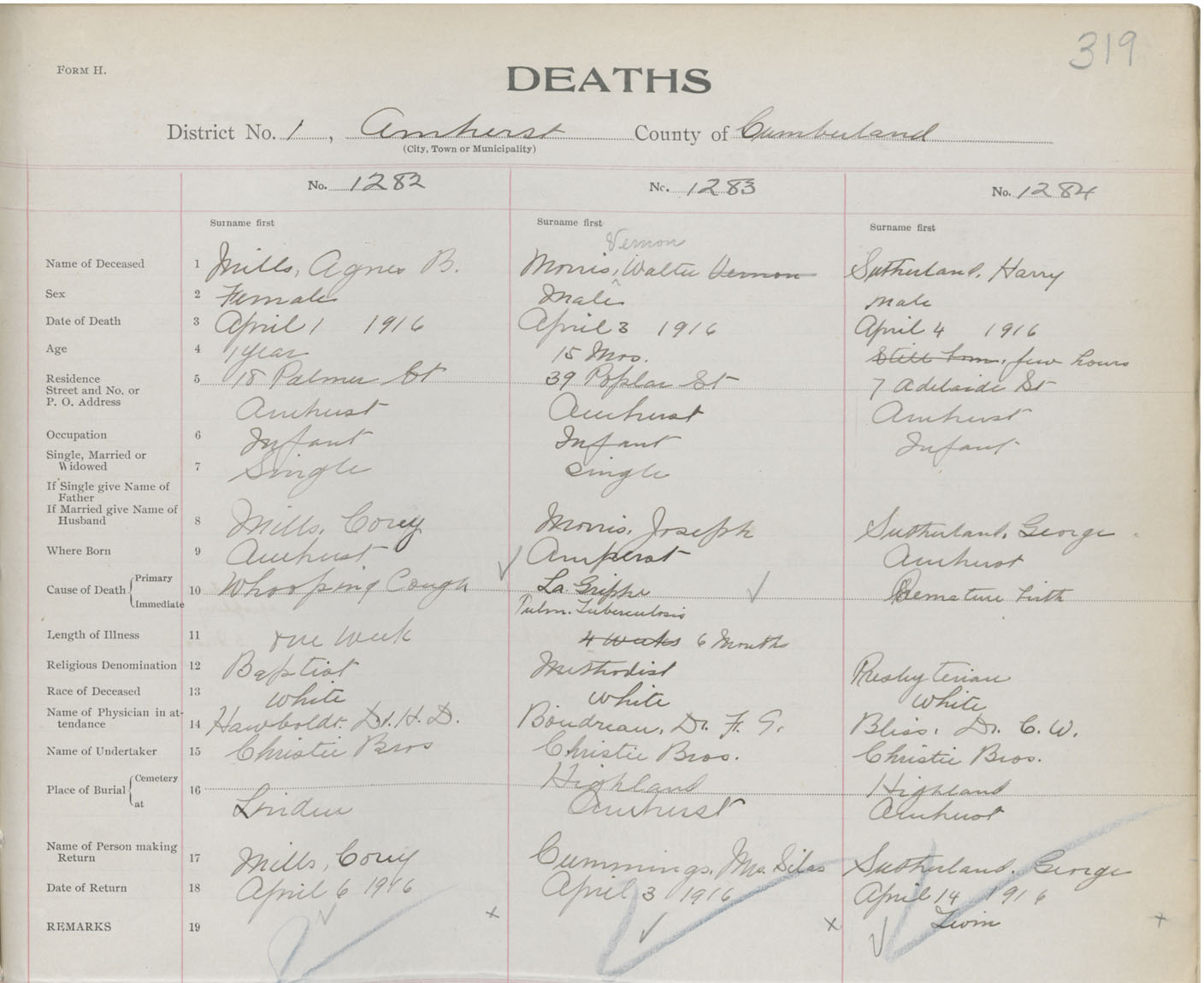 Female Death Registration: Year: 1916 book: 41 page: 319 number: 1282