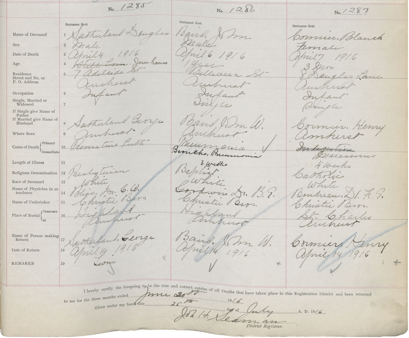 Male Death Registration: Year: 1916 book: 41 page: 319 number: 1285