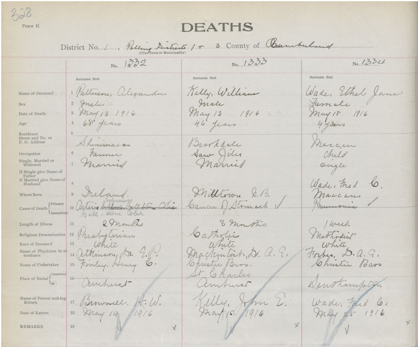 Male Death Registration: Year: 1916 book: 41 page: 328 number: 1332