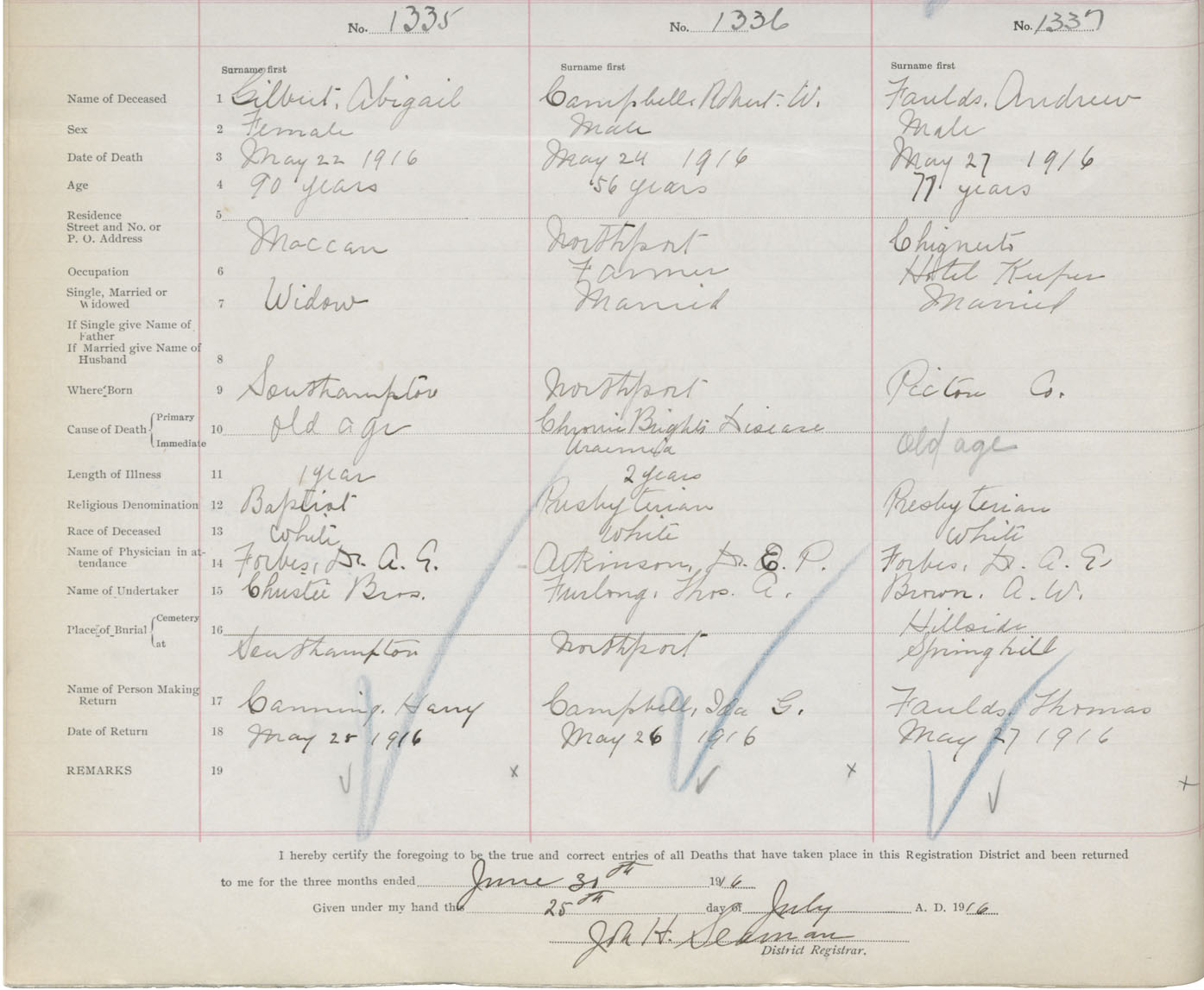 Female Death Registration: Year: 1916 book: 41 page: 328 number: 1335
