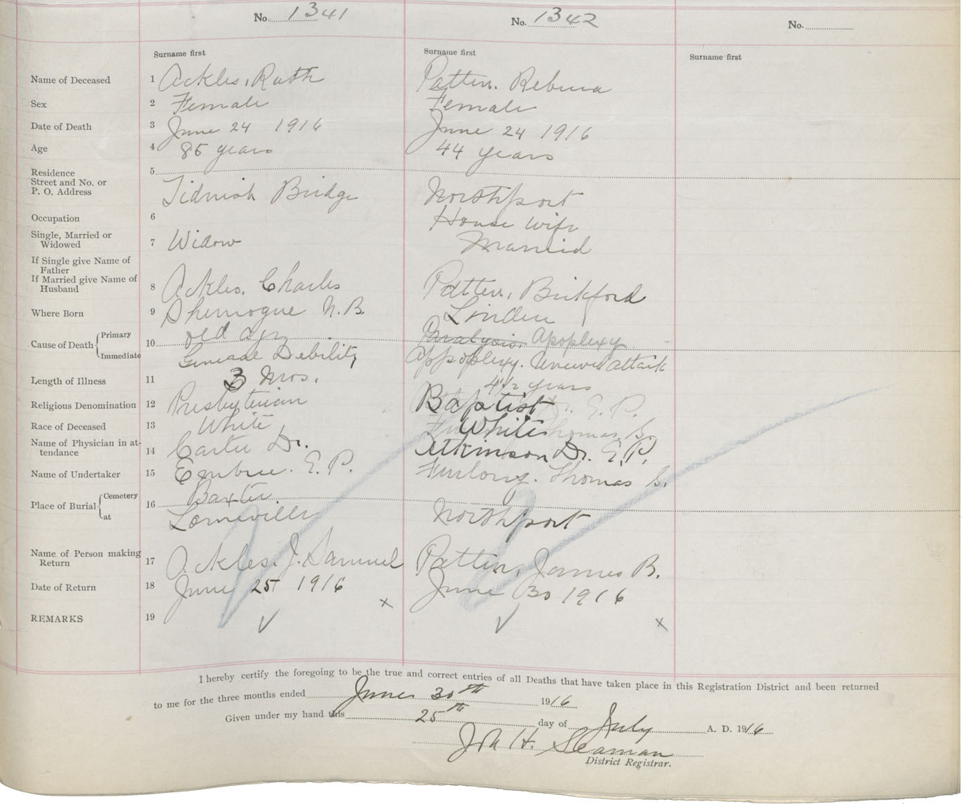Female Death Registration: Year: 1916 book: 41 page: 329 number: 1341