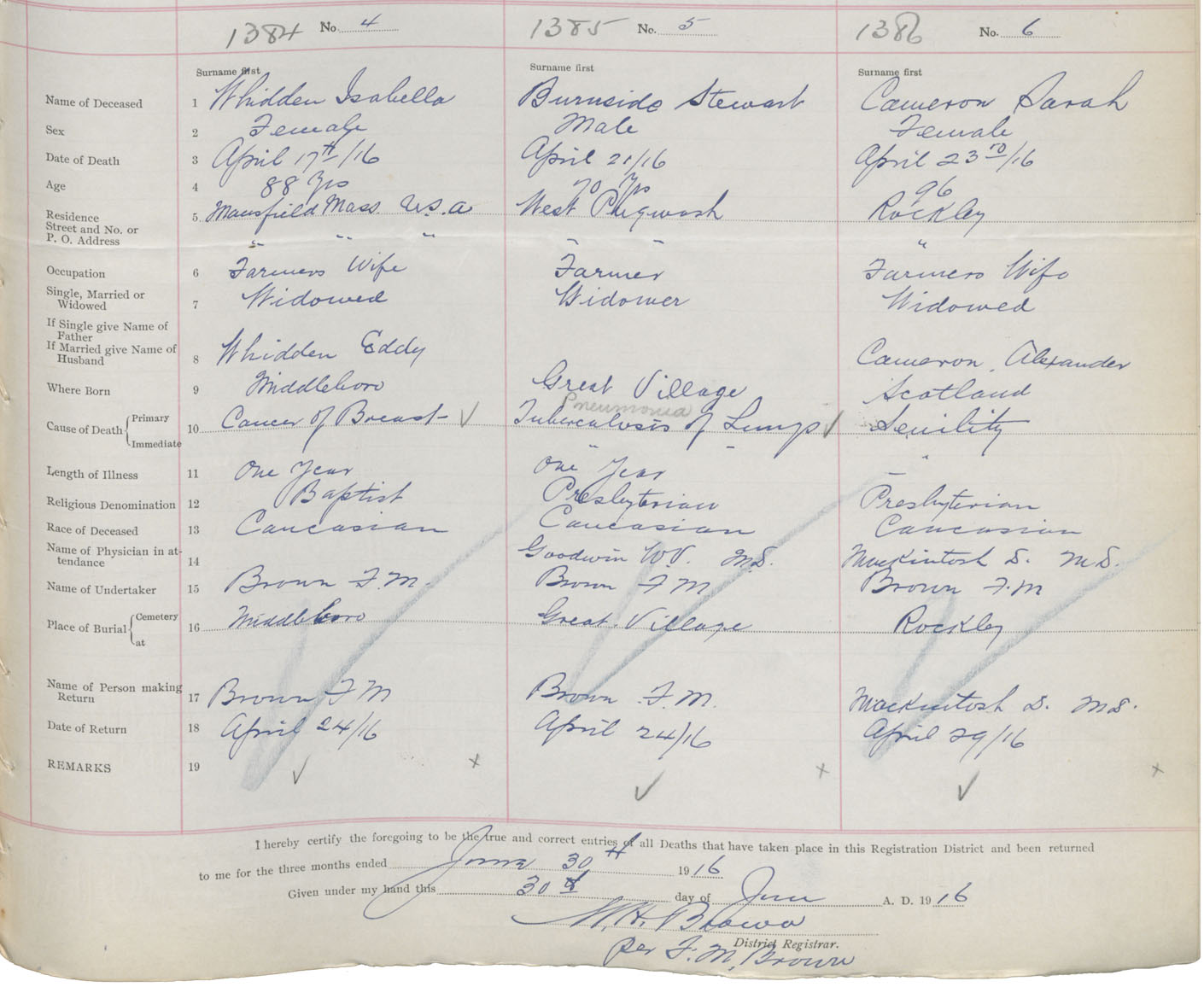 Female Death Registration: Year: 1916 book: 41 page: 341 number: 1384