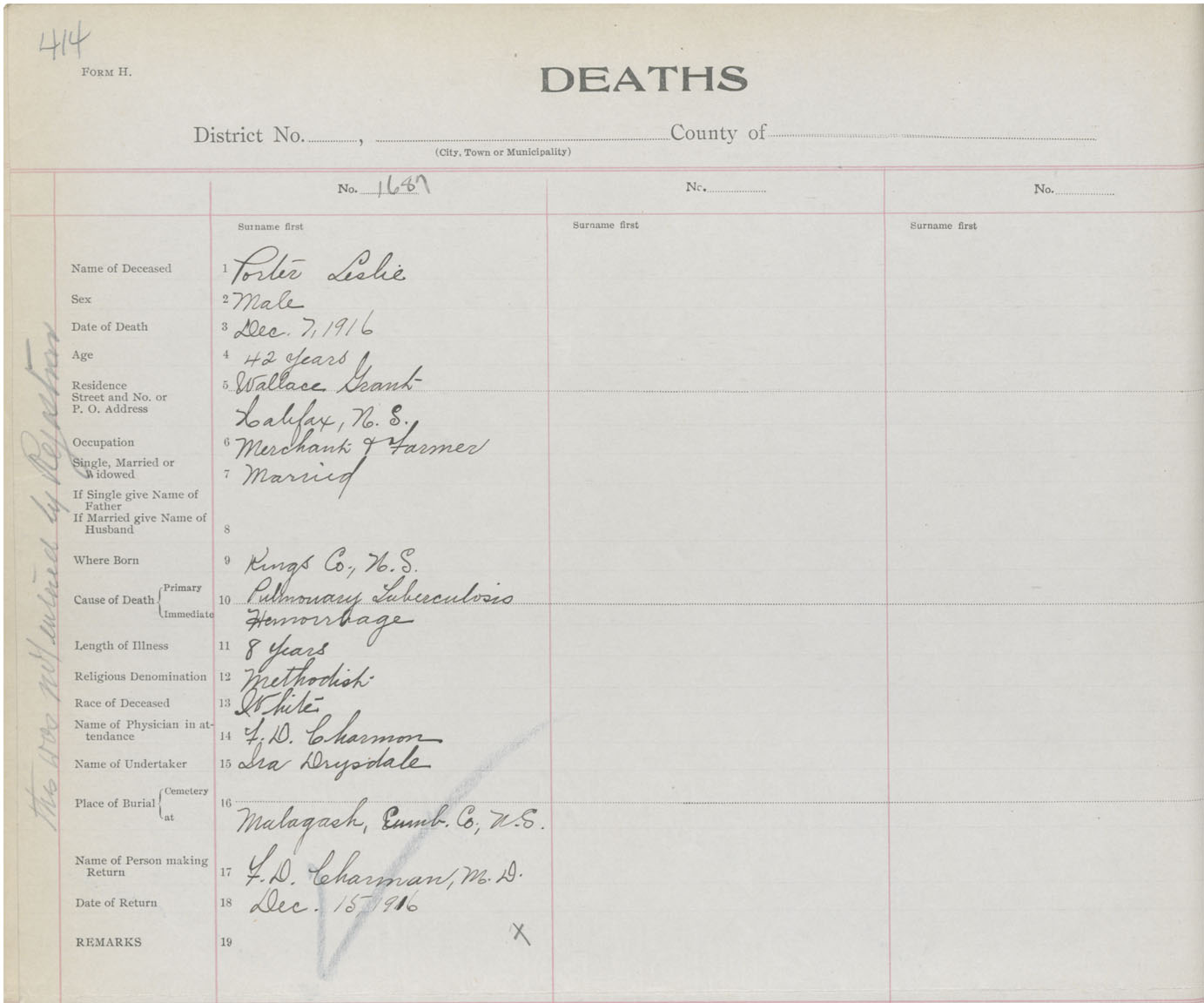 Death Registration: Year: 1916 book: 41 page: 414 number: 1687