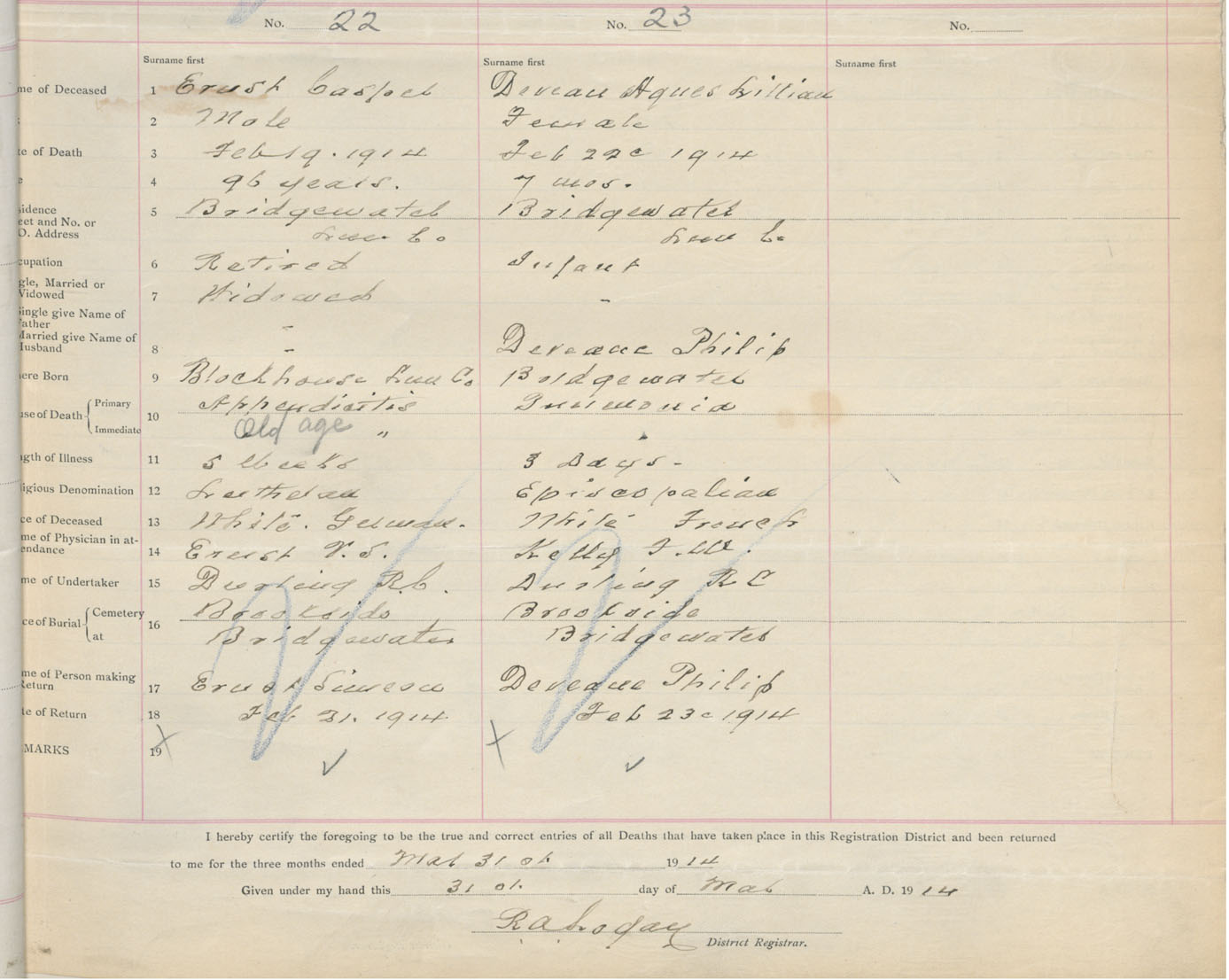 Death Registration: Year: 1914 book: 42 page: 5 number: 22