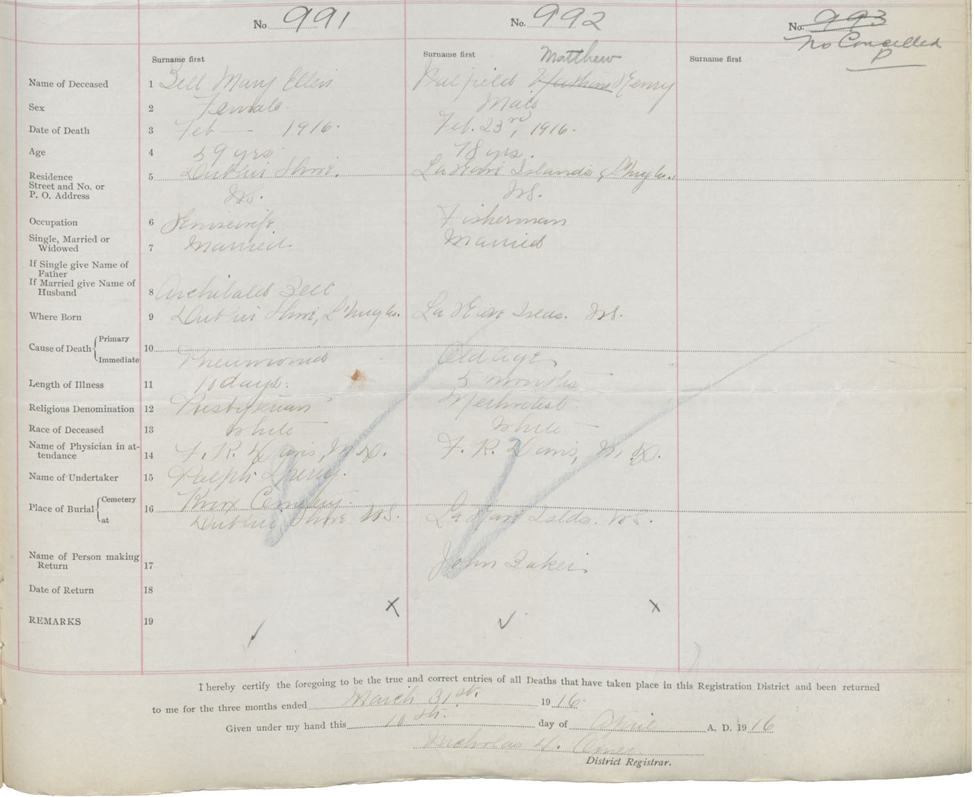 Death Registration: Year: 1916 book: 42 page: 303 number: 992