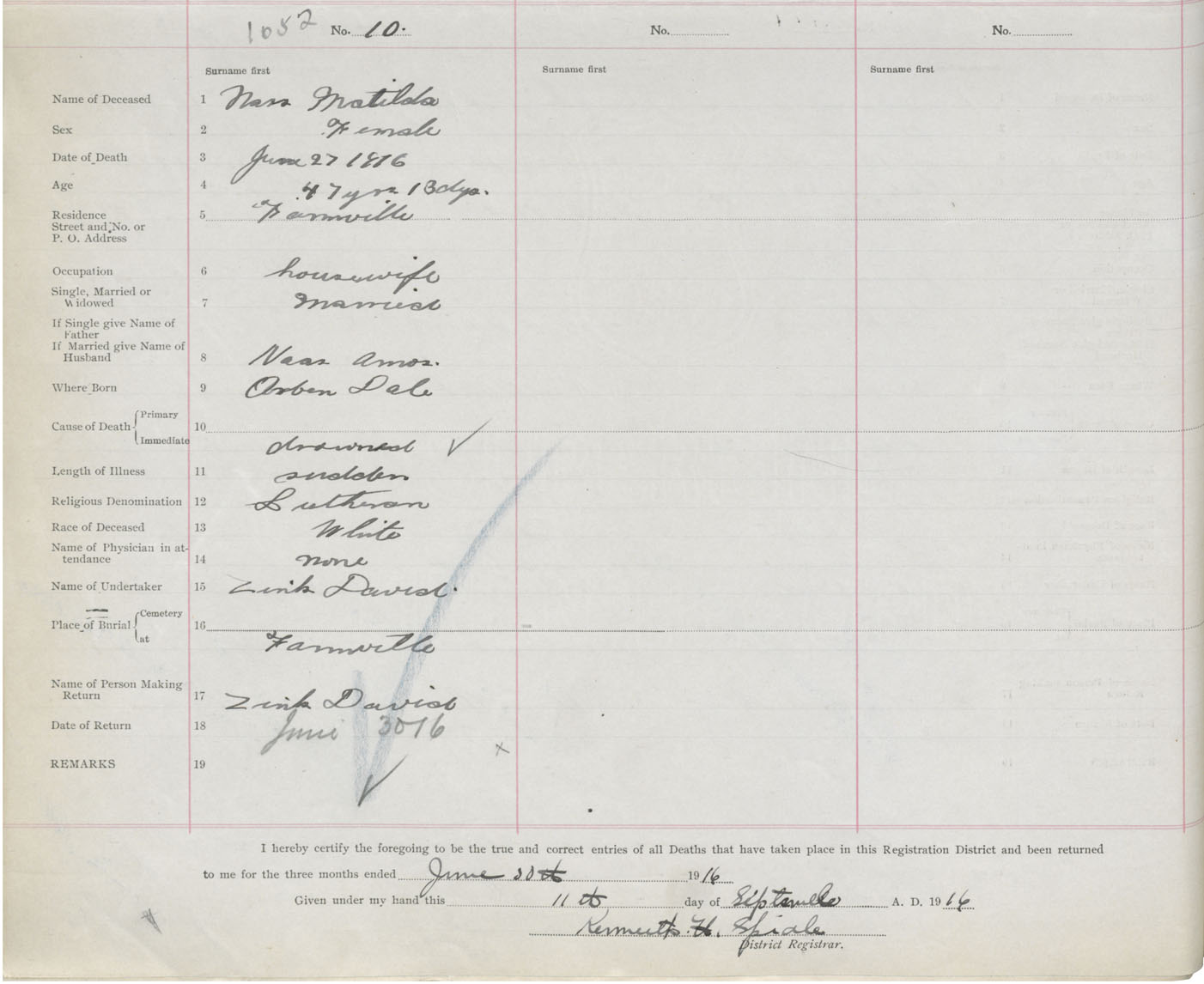 Death Registration: Year: 1916 book: 42 page: 320 number: 1052