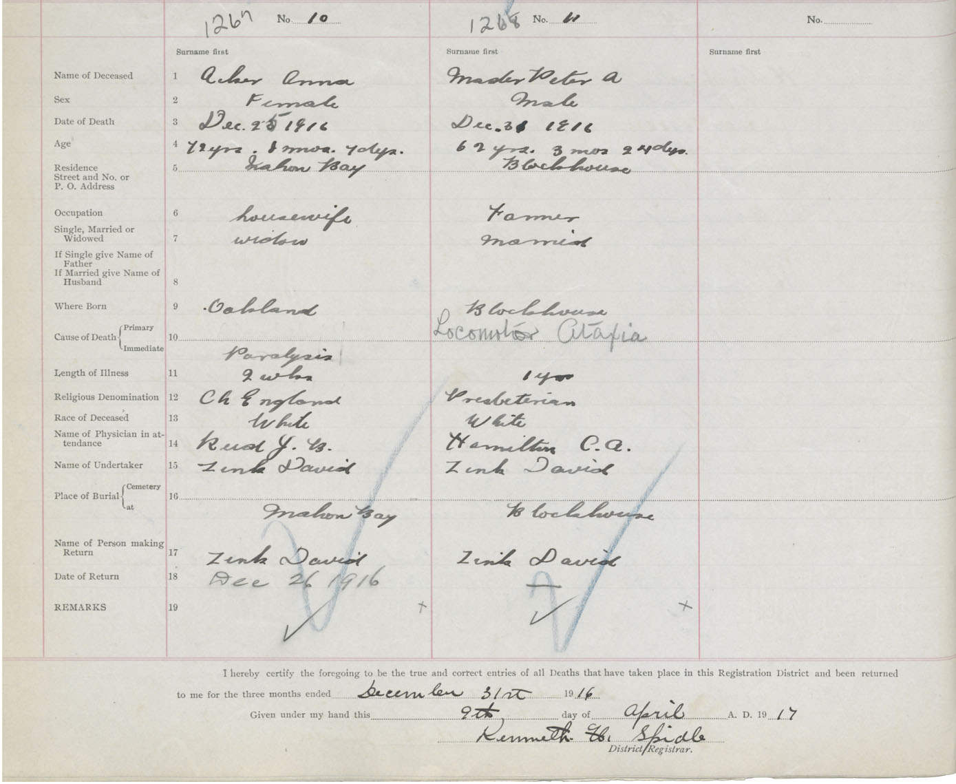 Death Registration: Year: 1916 book: 42 page: 388 number: 1267