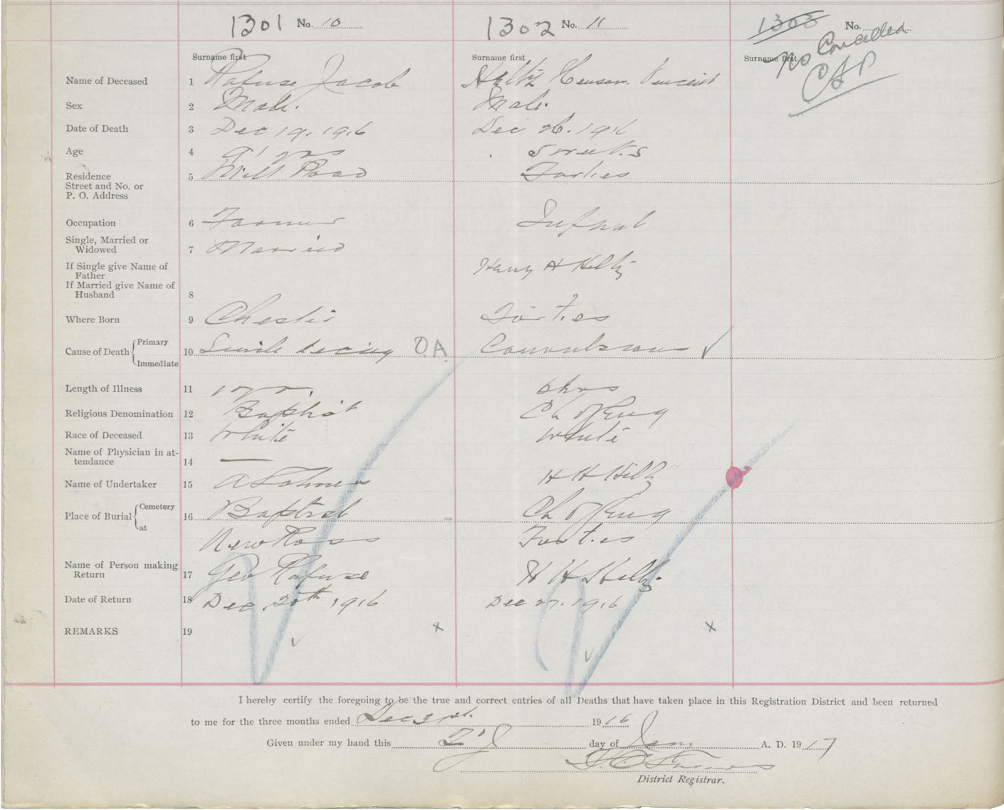 Death Registration: Year: 1916 book: 42 page: 398 number: 1301