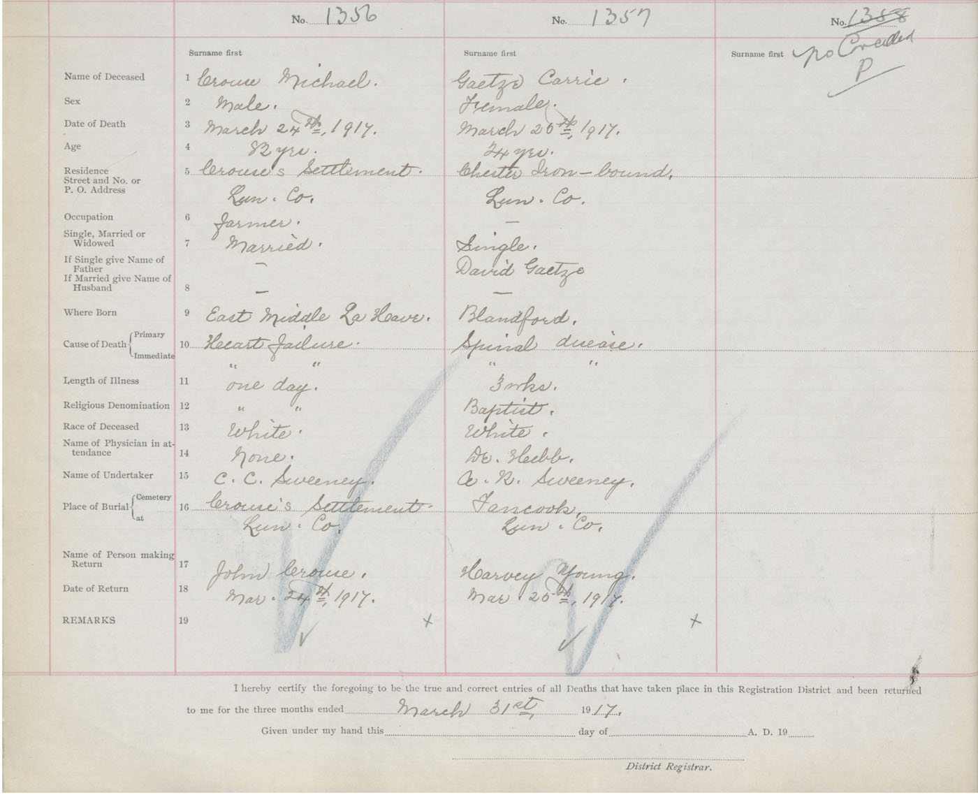 Death Registration: Year: 1917 book: 42 page: 412 number: 1357