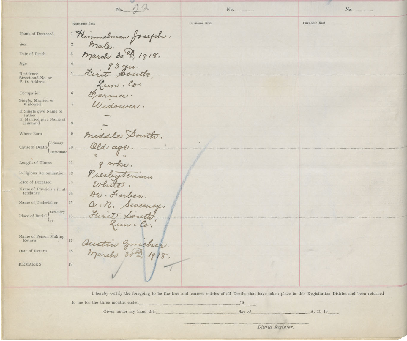 Male Death Registration: Year: 1918 book: 43 page: 6 number: 22