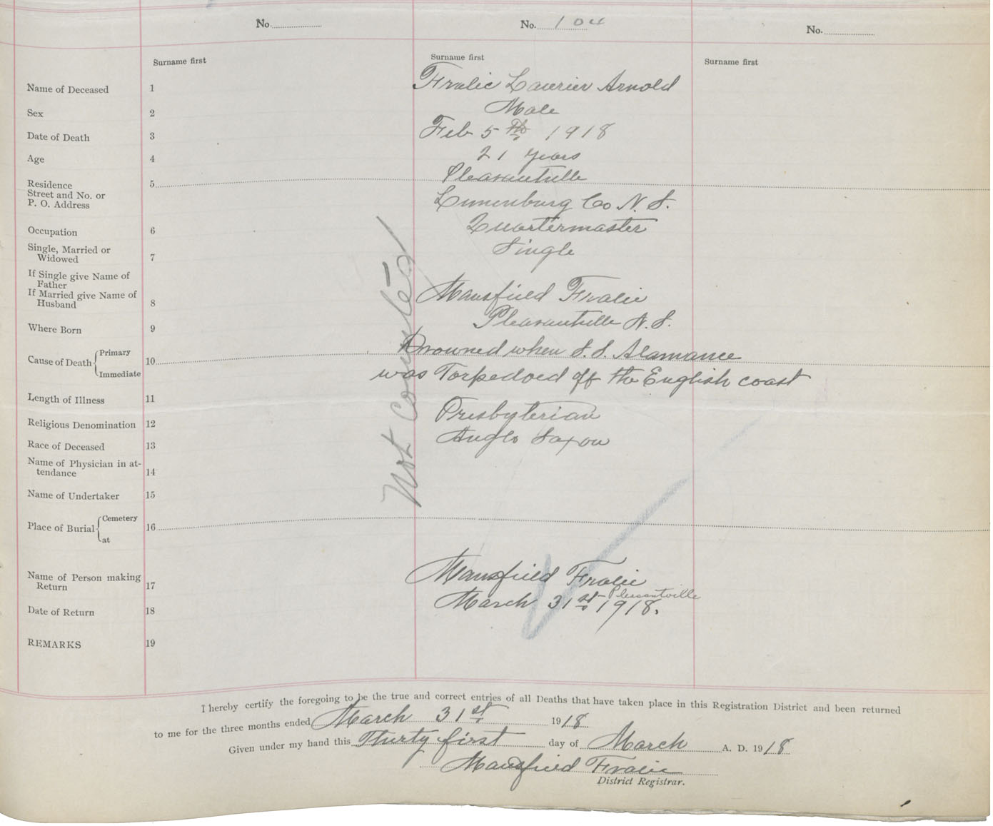 Death Registration: Year: 1918 book: 43 page: 29 number: 104